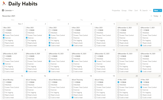 话说我在 iPhone 使用 Today (Habit tracker) 这款精美的手机应用时,察觉其欠缺一个可全面视察的介面,毕竟是一款只支持手机的应用而已。后来用上了 Notion,一款方便好用的资料库及笔记应用,参考了许多网上有关使用 Notion 的方法和创建习惯追踪器等资料,我也尝试自己在 Notion 上捣鼓了起来。