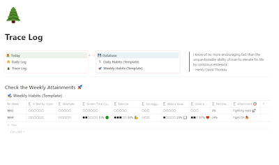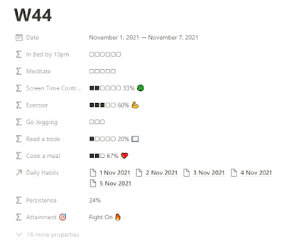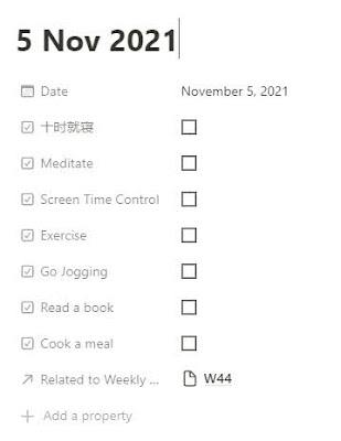 Trace Log 的数据是由 Weekly Habits 的数据库调度出来的,所以需要先创建 Weekly Habits 的数据库,数据库是由页面组成的,所以在设计页面的结构时,也同时完成了数据库的架构,反之亦然。不过在 Weekly Habits 的页面里,每个习惯的项目都含有一些简单的程式。并且通过 Notion 的 Relation 功能将指定的 Weekly Habits 和指定的 Daily Habits 页面的资料相串联起来。所以可以在 Weekly Habits 的页面里看到串联了此星期的日期的页面,也可以在 Daily Habits 的页面显示串联到哪一个星期(参考图一)了。以下的图五,是组成 Weekly Habits 数据的页面: