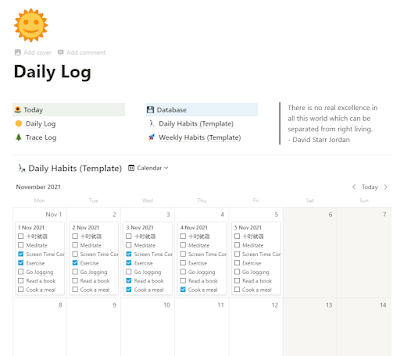 这 Habit Tracker 是在2021年11月完成的。其主要设计为两个子页面和两个数据库 (Daily Habits 和 Weekly Habits) 所构成,在主页面的上部分由两个互动模块(synced block)组成,这统一了页面的设计及能够指向所要到达的子页面或数据库。主页面接下来的部分则是显示相关数据表的资料,如上图。